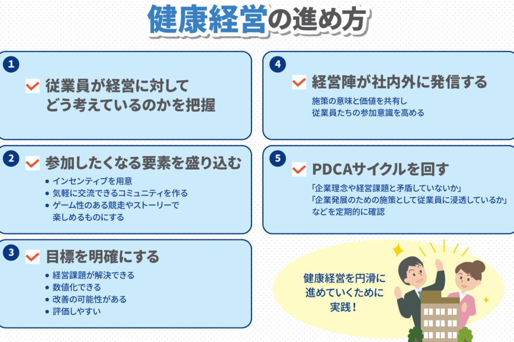 健康経営の実践にはいくつかの具体的な例があります。これらの実践は、企業が従業員の健康を大切にし、生産性を高めるための方法です。