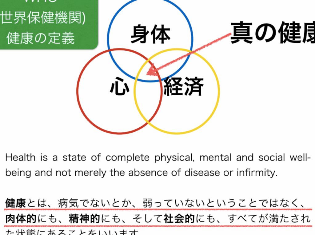 - 社会的健康:健全な人間関係を築き、コミュニティとのつながりを持てる状況。