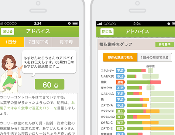 - 食事内容の評価: 栄養素の摂取量を計算し、必要な栄養素が足りているかを判定します。