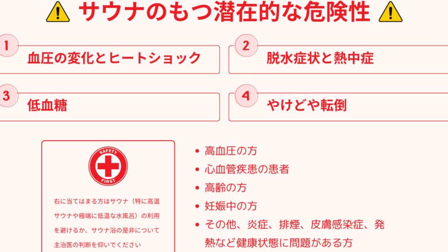 - 血圧の変動: サウナ内の温度差により血圧が急激に変動し、高血圧の人には危険となることがある。