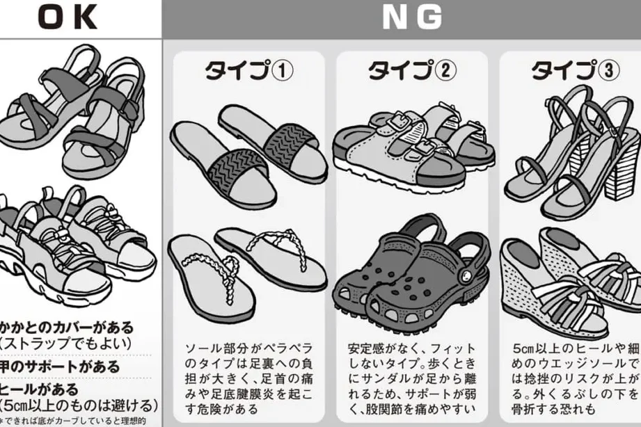 - クッション性のある素材: 硬い素材のサンダルは長時間履くと痛みを引き起こすことがある。