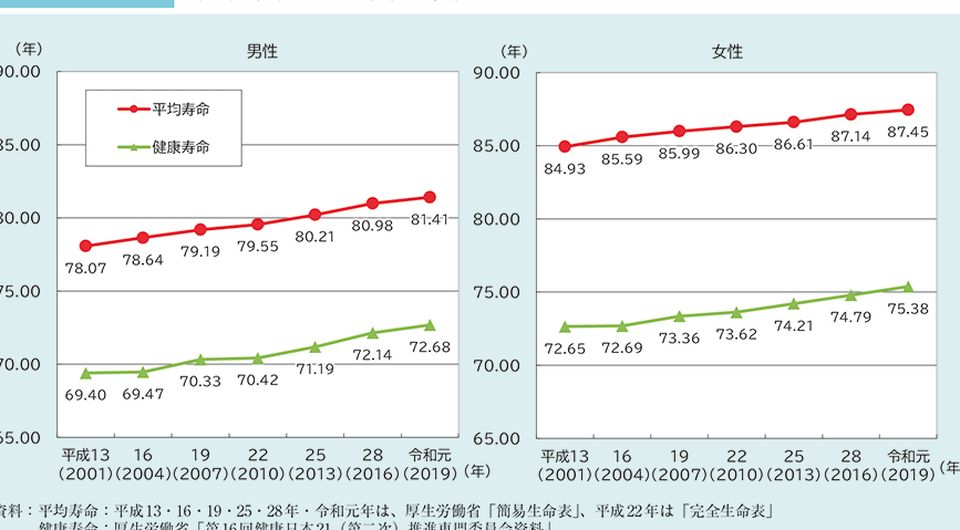 このデータからわかるように、年齢が上がるにつれて健康でいられる期間が短くなることが明らかです。また、生活習慣や医療アクセスも大きく影響します。