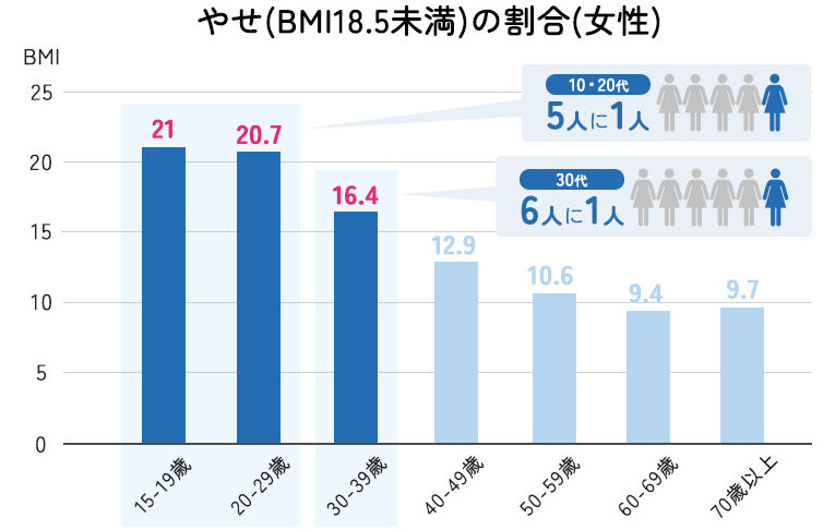 現在、20歳から39歳の女性の約25%がBMIが18.5未満に該当します。この数値は、全国的にも注意が必要な状況です。具体的には、以下のようなデータが示されています。