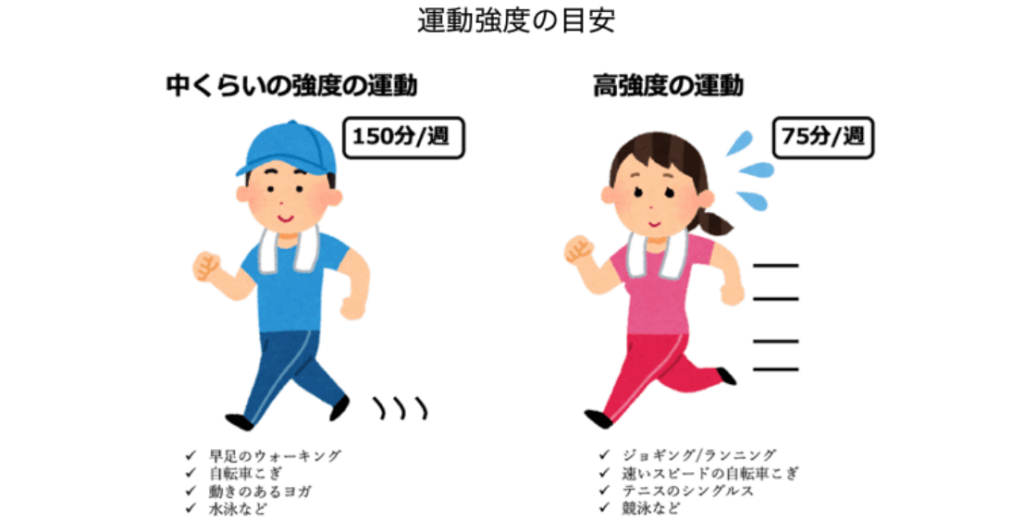 - 成人(19〜64歳): 週150分以上の中強度有酸素運動と、2回以上の筋力トレーニングがおすすめです。ジョギングやジムでのウェイトリフティングが良い例です。