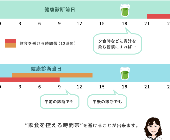 健康診断の約8時間前から水分の摂取を制限します。特に血液検査を受ける場合、カロリーのない飲み物(例:水や無糖のお茶)を選ぶのが賢明です。