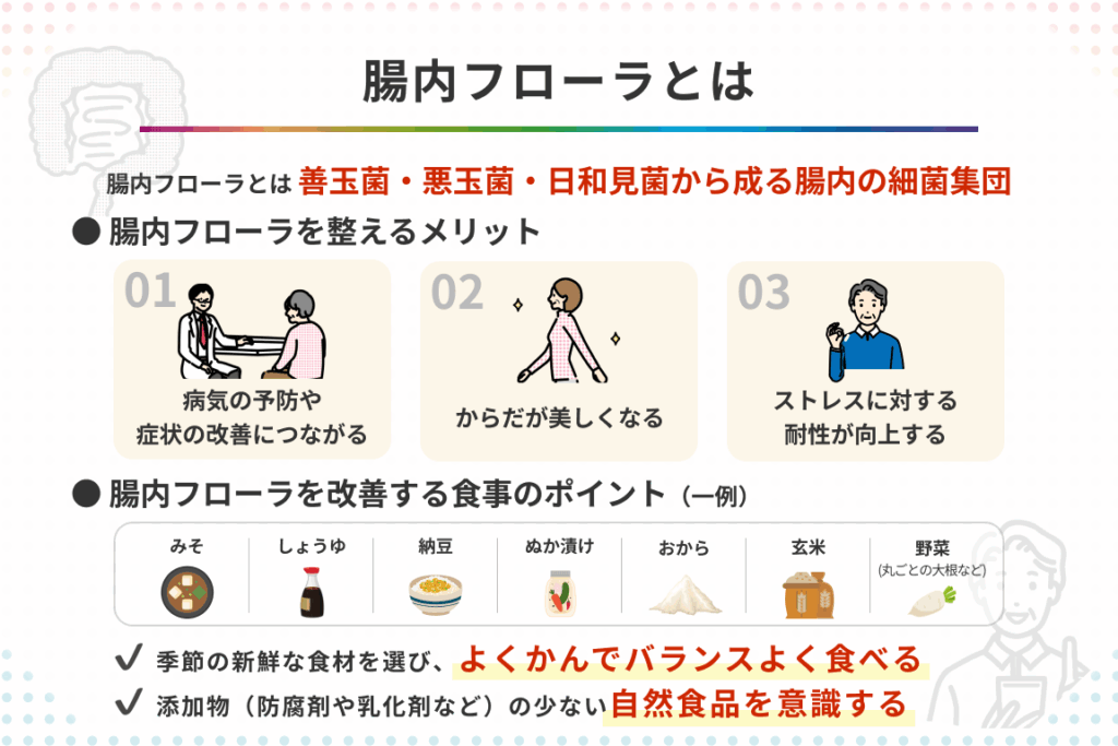 これらの食材をバランスよく摂取することで、腸内フローラの健康を維持できます。