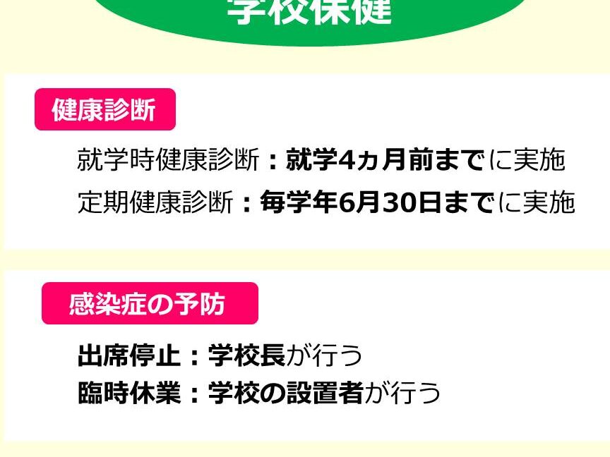 この法律に基づく定期健康診断は、児童生徒の健康状態を確認するために重要です。学校が果たすべき役割として、健康診断の実施を義務付けています。