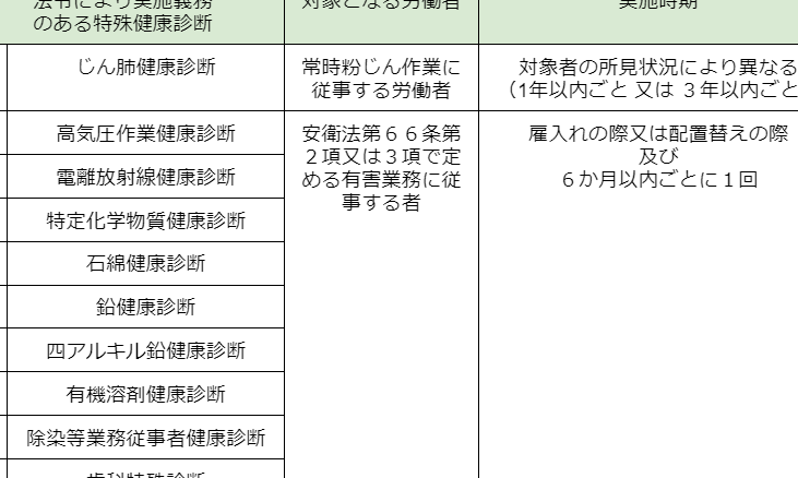 特定の業種では、労働安全衛生法に基づき、事業者は常時従事する労働者に対して特殊健康診断を実施する義務を負っている。この法律は、労働者の健康を損なうリスクを軽減する目的で制定されており、定期的な健康診断の実施を義務付けている。具体的には以下のようなポイントが含まれる。