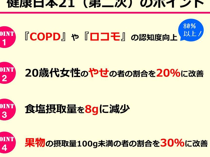 また、この取り組みは国民全体への啓発活動も含まれています。私たちは、健康的な食事や運動習慣の重要性を広めることが求められます。以下は、主な施策の一部です: