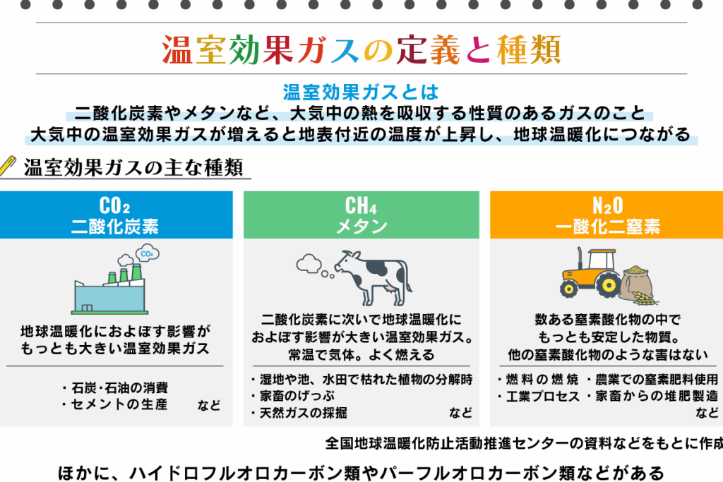 - メタン(CH4): 農業や廃棄物処理から発生する。