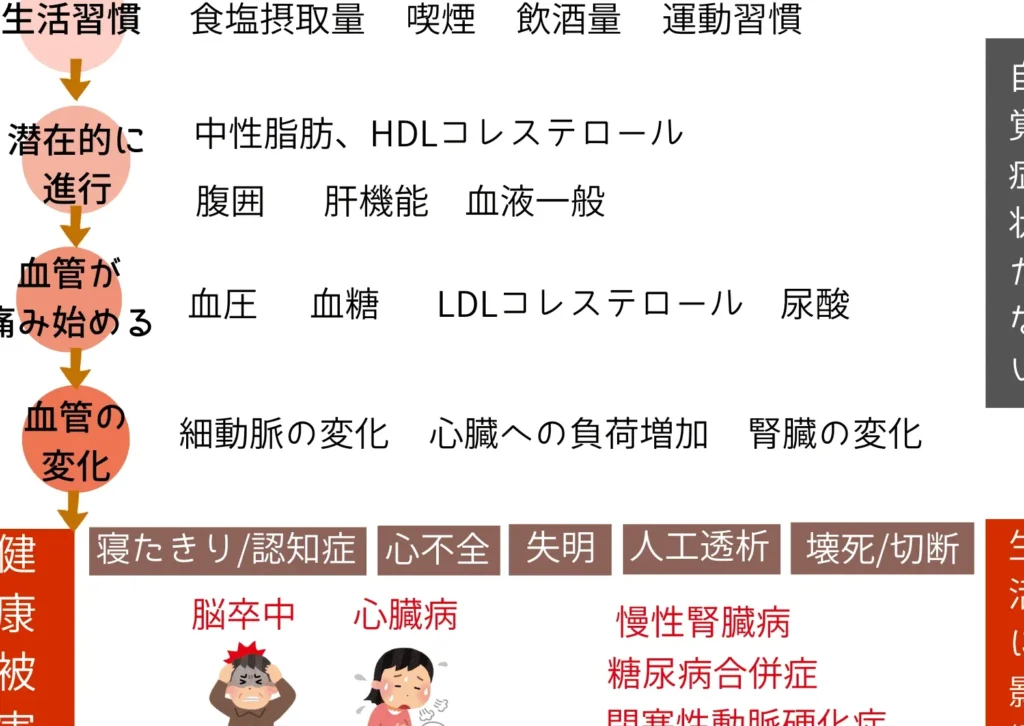 - 予防医療: 将来起こりうる病気を未然に防ぐため、リスク要因があるかどうかチェックします。