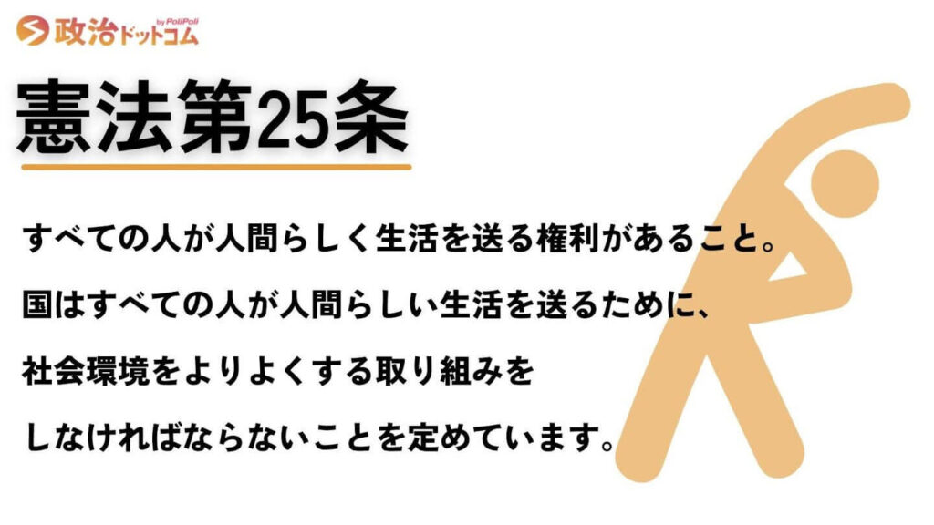 日本国憲法第25条では、「すべての人は健康で文化的な最低限度の生活を営む権利を有する」と規定している。この条文により、個々人が自らの生活水準を向上させることが期待されている。また、この権利は国家に対し、適切な施策や法律を通じて保障される責任があることも示唆している。