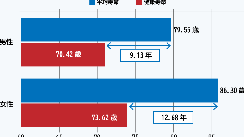 健康寿命は、病気や障害のない状態で過ごせる期間を指します。これは、単なる寿命と異なり、日常生活を自立して送れる時間に焦点を当てています。日本では、2021年のデータによると、日本人の健康寿命は男性で81.64歳、女性で87.74歳です。この数値が示す通り、私たちの生活の質はこの概念によって大きく影響されます。